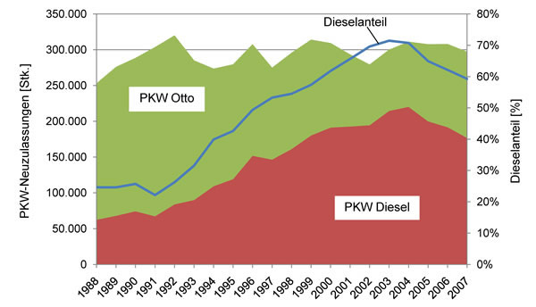 Wie in Abbildung 3 dargestellt stieg die Dieselproduktion, bedingt durch den in Abbildung 4 abgebildeten Zuwachs an Diesel-PKW deutlich an. Der Dieselanteil an Neuzulassungen erreichte 2003 mit 71,5% seinen Höhepunkt. Seither geht der Neuzulassungsanteil an Diesel-PKW zurück. Die intensive Marktdurchdringung der letzten Jahre führt jedoch zu einem kontinuierlich ansteigenden Bestand an Diesel-PKW, sodass im Jahr 2007 rund 54% der PKW mit Dieselmotoren ausgestattet sind. [7], [8] |